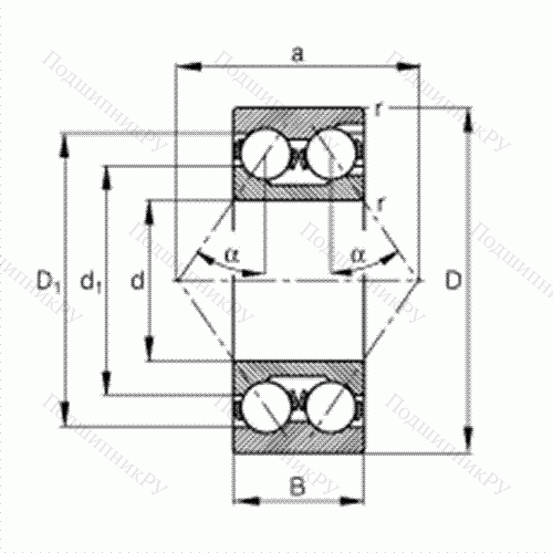 Основные размеры по DIN 628-3, двухрядные, с канавкой для ввода шариков, угол контакта α = 35°